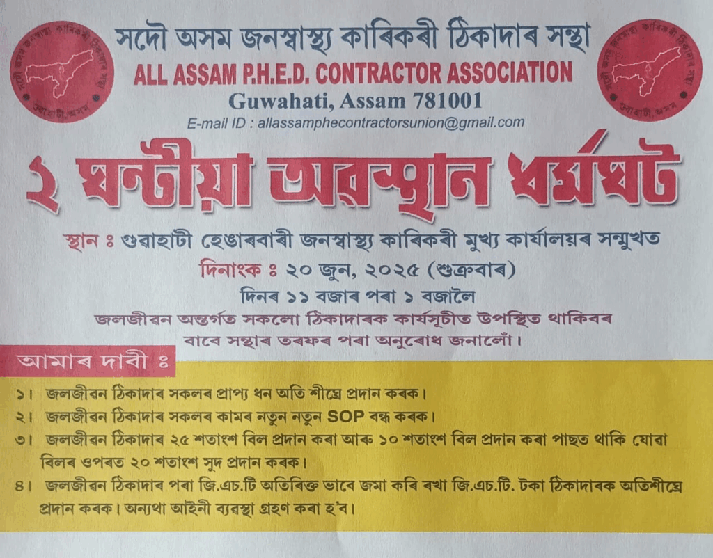 উল্লেখ্য যে অহা ২০ জুনত ২ ঘণ্টীয়া অৱস্থান ধৰ্মঘট কাৰ্যসূচী গ্ৰহণ কৰাৰ কথা আছিল সদৌ অসম জনস্বাস্থ্য কাৰিকৰী ঠিকাদাৰ সন্থাই। কিন্তু এই সাক্ষাতৰ পিছতে মন্ত্ৰী জয়ন্ত মল্লবৰুৱাৰ আশ্বাস পূৰ্ণ বক্তব্যখিনিক সন্মান জনাই অহা আগষ্ট মাহলৈ কোনো ধৰণৰ কাৰ্যসূচী হাতত নোলোৱাৰ সিদ্ধান্ত গ্ৰহণ কৰা হয়।