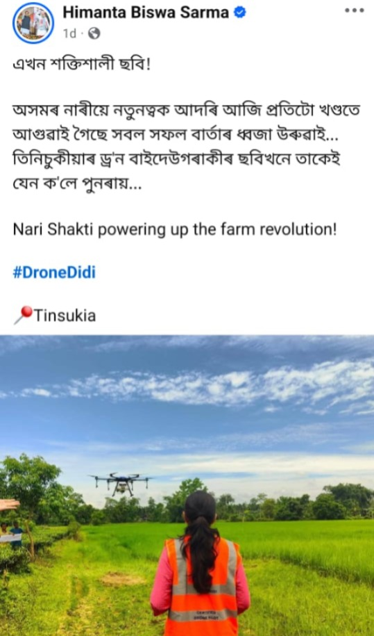 ড্ৰ’নৰ জৰিয়তে কৃষি পথাৰত ঔষধ চটিয়াই চৰ্চাত বেবী গগৈ চেতিয়া। কৃষি সখী হিচাপে কৰ্মৰত বেবী গগৈয়ে আধুনিক পৰিস্থিতিৰ স’তে মিলিব পৰাকৈ কৃষি পথাৰত এইদৰে উন্নত পদ্ধতিৰে সাৰ-পানী যোগান ধৰা কাৰ্যত এতিয়া মোহাচন্ন সকলো। মহিলাগৰাকীৰ এই কাৰ্য মুখ্যমন্ত্ৰীৰ চকুত পৰাৰ পাছতেই মুখ্যমন্ত্ৰীয়ে এইদৰে সামাজিক মাধ্যমত ফটো শ্বেয়াৰ কৰি লিখিলে, ‘‘এখন শক্তিশালী ছবি’’।