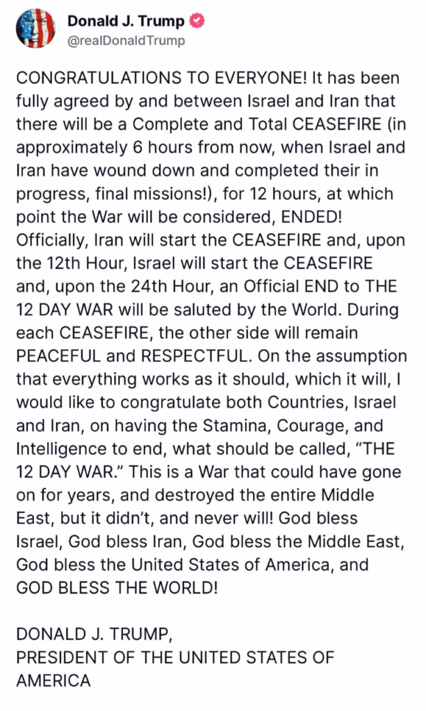 মধ্যপ্ৰাচ্যত ১২ দিনীয়া যুদ্ধ অৱসান হোৱাৰ পথত। ইৰাণ-ইজৰাইলৰ যুদ্ধ বিৰতিৰ আনুষ্ঠানিক ঘোষণা ট্ৰাম্পৰ। X হেণ্ডলযোগে যুদ্ধ বিৰতিৰ ঘোষণা আমেৰিকাৰ ৰাষ্ট্ৰপতি ড’নাল্ড ট্ৰাম্পৰ। যুদ্ধ বিৰতিৰ বাবে ইৰাণ–ইজৰাইলক ধন্যবাদ ড’নাল্ড ট্ৰাম্পৰ। যুদ্ধ বিৰতিৰ পূৰ্বে আমেৰিকাৰ বায়ুসেনাৰ ঘাটিত প্ৰচণ্ড আক্ৰমণ ইৰাণৰ। কাটাৰ–ইৰাকত আমেৰিকান সেনাৰ ঘাটিত ক্ষেপণাস্ত্ৰৰে আক্ৰমণ ইৰাণৰ। ইৰাণৰ পাৰমাণৱিক কেন্দ্ৰত আমেৰিকাৰ আক্ৰমণৰ প্ৰত্যুত্তৰত এই আক্ৰমণ। ইৰাণৰ আক্ৰমণৰ পিছতেই দুয়োখন দেশৰ যুদ্ধ বিৰতিৰ ঘোষণা আমেৰিকাৰ। ট্ৰাম্পৰ ঘোষণাৰ পিছতেই X হেণ্ডলত প্ৰতিক্ৰিয়া আয়াতোল্লা খামেইনিৰ। খামেইনিৰ দাবী– ইৰাণৰ জনসাধাৰণে কেতিয়াও আত্মসমৰ্পণ নকৰে। ইৰাণ-ইজৰাইলৰ যুদ্ধক লৈ বিশ্বজুৰি সৃষ্টি হৈছিল শংকাৰ। যুদ্ধত পাৰমাণৱিক অস্ত্ৰ ব্যৱহাৰৰ আশংকাত শংকিত হৈ পৰিছিল বিশ্ব।