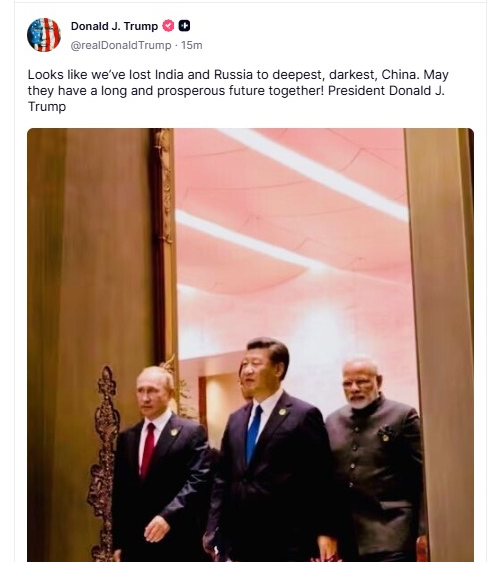 শেহতীয়াকৈ এছচিঅ’ সন্মিলনত অংশগ্ৰহণৰ বাবে ভাৰতৰ প্ৰধানমন্ত্ৰী নৰেন্দ্ৰ মোদী চীনলৈ গৈছিল। তাত ৰাছিয়াৰ ৰাষ্ট্ৰপতি ভ্লাদিমিৰ পুটিনৰ সৈতেও তেওঁৰ সাক্ষাৎ হৈছিল। মোদীয়ে জিনপিং আৰু পুটিনৰ সৈতে পৃথকে পৃথকে দ্বিপাক্ষিক বৈঠক কৰে। ভাৰতৰ সৈতে এই দুখন দেশৰ সু-সম্পৰ্কৰ বাৰ্তা প্ৰকাশ কৰা হৈছিল। প্ৰথমৰ পৰাই চীনৰ তিয়ানজিন চহৰত এই তিনি ৰাষ্ট্ৰপ্ৰধানৰ সাক্ষাৎক ট্ৰাম্পে কটাক্ষ কৰি আহিছিল। শুকুৰবাৰে তেওঁ মোদী, পুটিন আৰু জিনপিঙৰ এই সন্মিলনৰ এখন ফটো পোষ্ট কৰিলে। তাত লিখিলে মাত্ৰ দুশাৰী কথা, “এনে লাগিছে আমি ভাৰত আৰু ৰাছিয়াক চীনৰ গভীৰতম, অন্ধকাৰতম পৰিস্থিতিত হেৰুৱাই পেলাইছো। তেওঁলোকৰ ভৱিষ্যত দীৰ্ঘ আৰু সমৃদ্ধ হওক, এই কামনা কৰোঁ।”